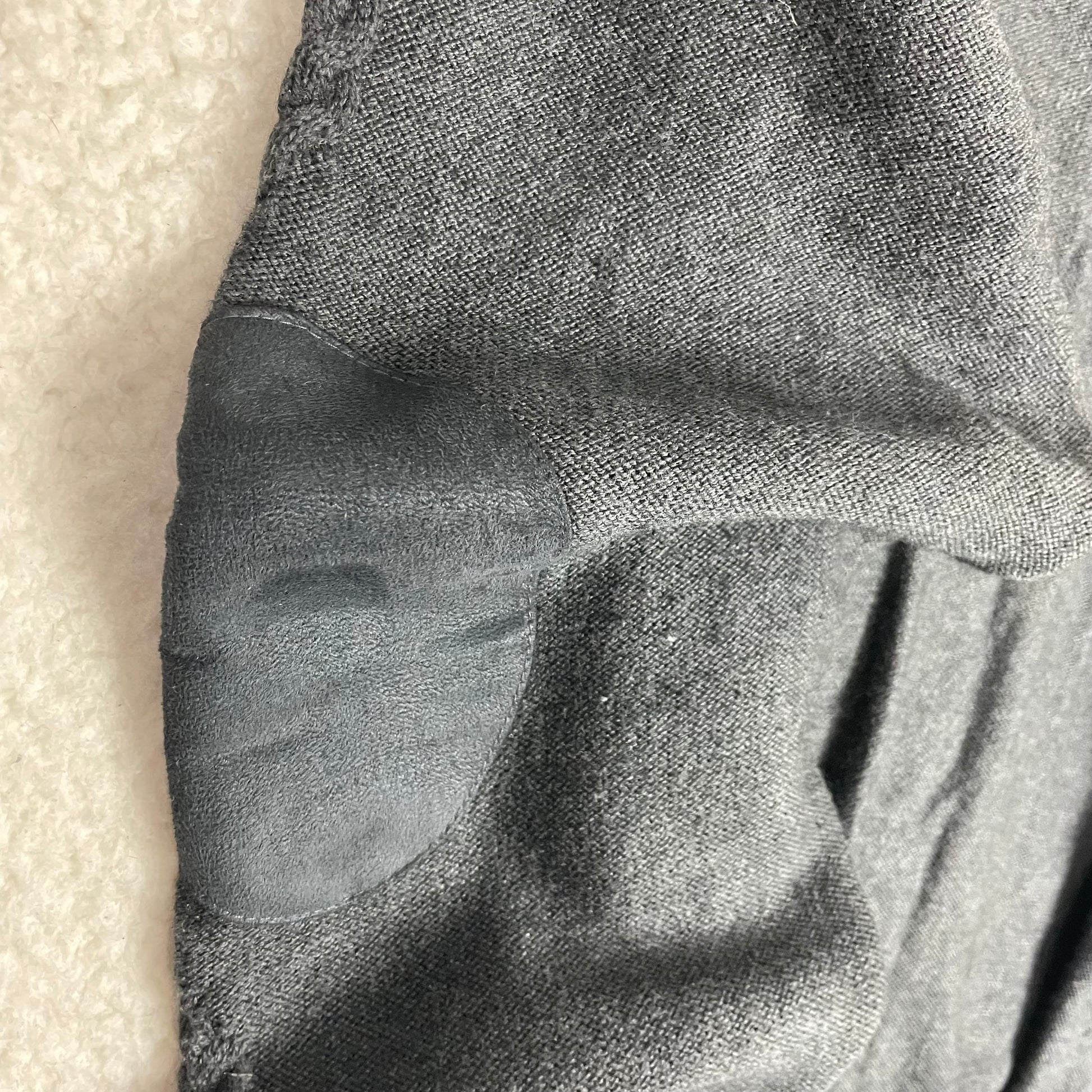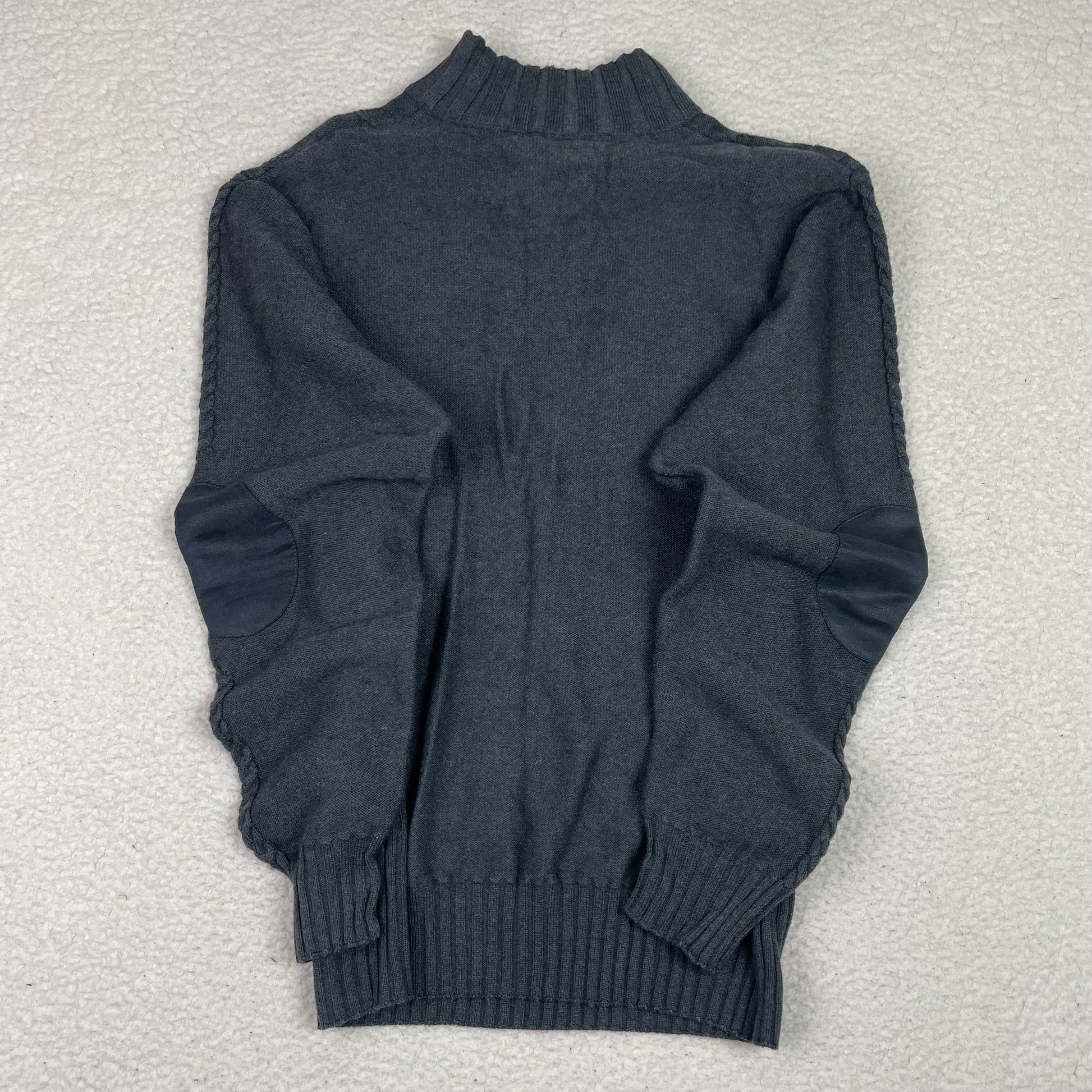 Features: elbow patch, cable knit, buttons